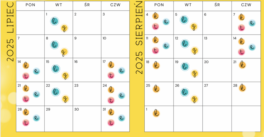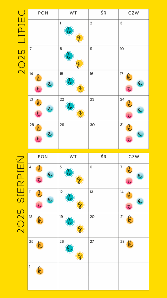 Nasze kursy wakacyjne trwają 2 miesiące i obejmują 8-15 spotkań, które odbywają się w zależności od wybranej oferty.